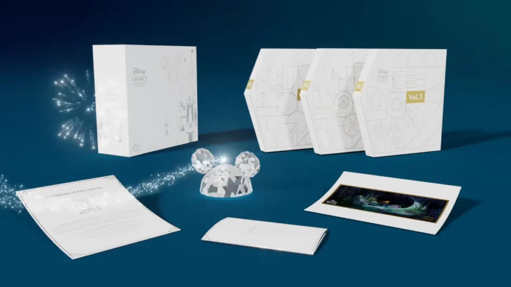 Disney Legacy Animated Film Collection zawiera 100 tytułów na Blu-ray, wraz z kodami cyfrowymi dla każdego z nich i książeczką zawierającą plakaty kinowe. W zestawie znajduje się również litografia do nadchodzącego filmu animowanego Disneya „Życzenie” i mała kryształowa czapka z uszami Myszki Miki. Pełna lista tytułów prezentuje się następująco: