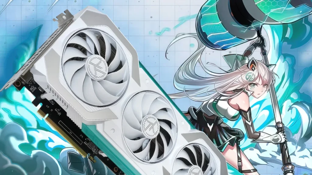 Karta ASUS GeForce RTX 4070 Tianxuan również jest utrzymana w biało cyjanowej kolorystyce, a prócz tego oferuje układ chłodzenia z trzema wentylatorami. Oba urządzenia wyposażone są w złącze zasilania HPCE, dzięki czemu GPU może pobierać energię bezpośrednio z płyty głównej bez fizycznego dodatkowego przewodu zasilającego.