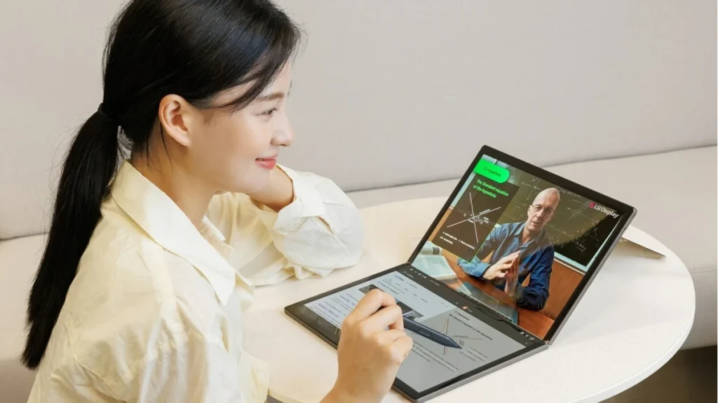 17″ składany ekran OLED wykorzystuje specjalny materiał, który minimalizuje zagniecenia w obszarze składania. Skutkuje to płynnym wyświetlaniem i wysoką jakością obrazu, w przeciwieństwie do innych paneli tego typu. Ponadto charakteryzuje się konstrukcją typu „in-folding”, umożliwiającą jego łatwe składanie do wewnątrz.