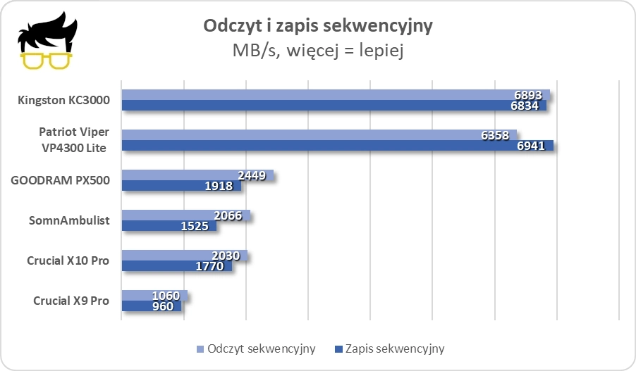 Testy syntetyczne wypadają wzorowo. Patriot Viper VP4300 Lite jest w stanie wyprzedzić nawet droższą i często polecaną konkurencją, jak Kingston KC3000. Znajduje to również potwierdzenie przy realnym kopiowaniu plików, gdzie testowany SSD ląduje na początku stawki. Kopiowanie jednego dużego pliku o wadze 63 GB zajmuje około 23,2 sekundy. Innymi słowy to dobra propozycja zarówno do pracy, jak i grania.