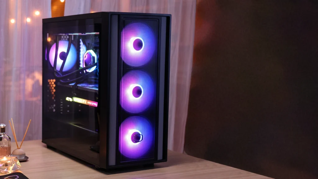 • Cooler Master SickleFlow140 ARGB PWM w ilości trzech sztuk. Są to wentylatory w rozmiarze 140 mm wyposażone w podświetlenie ARGB LED, osiągające prędkość do 1800 RPM, wydajność do 67 CFM oraz ciśnienie dochodzące do 2,2 mmH2O.