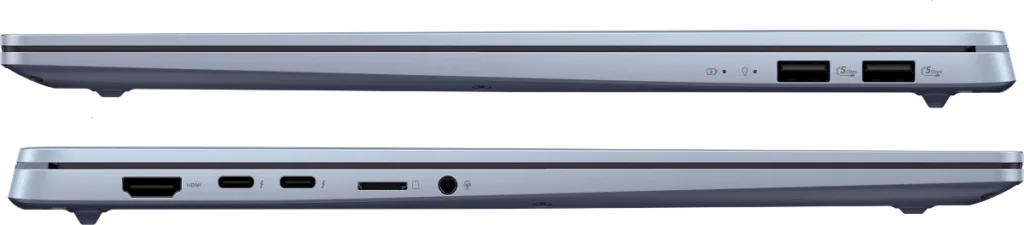 Gdy przyjrzymy się złączom, znajdziemy tutaj 2x USB typu A 3.2 Gen1, 2x USB 4.0 Thunderbolt, 1x HDMI 2.1, wejście audio oraz czytnik kart Micro SD. Wymiary ASUSa Vivobook S15 wynoszą 352,6 x 226,9 x 147 – 159 mm a masa to zaledwie 1,42 kg. Wbudowany akumulator ma pojemność 70 Wh.