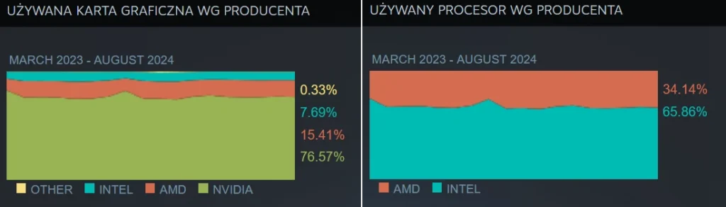 Według danych opublikowanych za sierpień 2024 roku, karty graficzne NVIDII wybiera aż 76,57% graczy. Po propozycje AMD sięga 15,41% konsumentów, a po rozwiązania Intela 7,69%. To lekki wzrost dla drużyny Czerwonych, która jeszcze w marcu posiadała 14,6% udziałów w rynku. Intel nadal króluje w przypadku procesorów, z ich układów korzysta aż 65,86% graczy, lecz tutaj również wyraźnie zyskuje AMD. Prawdopodobnie ze względu na ostatnie głośne problemy Niebieskich z procesorami Intel Core 13. i 14. generacji.