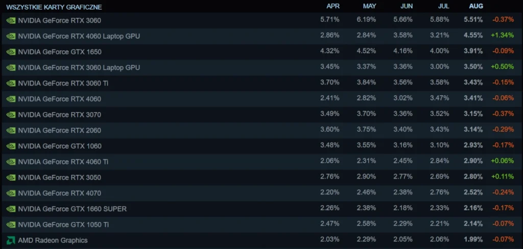 Najpopularniejszą kartą graficzną jest nieprzerwanie NVIDIA GeForce RTX 3060, z której korzysta 5,51% ankietowanych. AMD nie ma powodów do zadowolenia bo ich najpopularniejsza propozycja znalazła się dopiero na 16 miejscu i jest to… układ zintegrowany w procesorach. Pierwsza dedykowana karta graficzna Czerwonych w zestawieniu wylądowała dopiero na 35 miejscu i mowa o AMD Radeon RX 580.