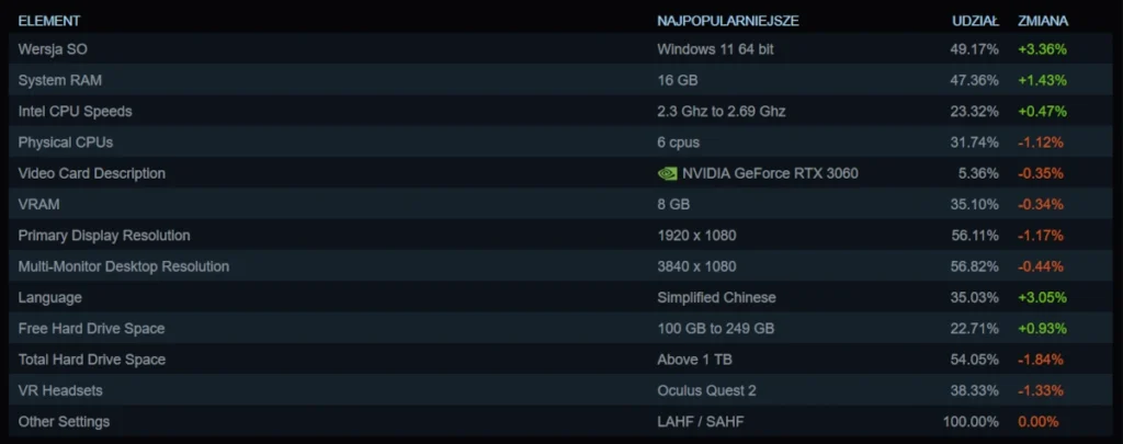 Pewnym zaskoczeniem może być wzrost zainteresowania systemem operacyjnym Windows 11, który w tym miesiącu przekroczył barierę 50% użytkowników Steama. Powodem takiej sytuacji może być kupno nowych laptopów i gotowych PC, które przychodzą już z zainstalowanymi najnowszymi „Okienkami”. W przypadku rozdzielczości ekranu góruje Full HD (1920 x 1080 pikseli), z której korzysta aż 56,11% osób.