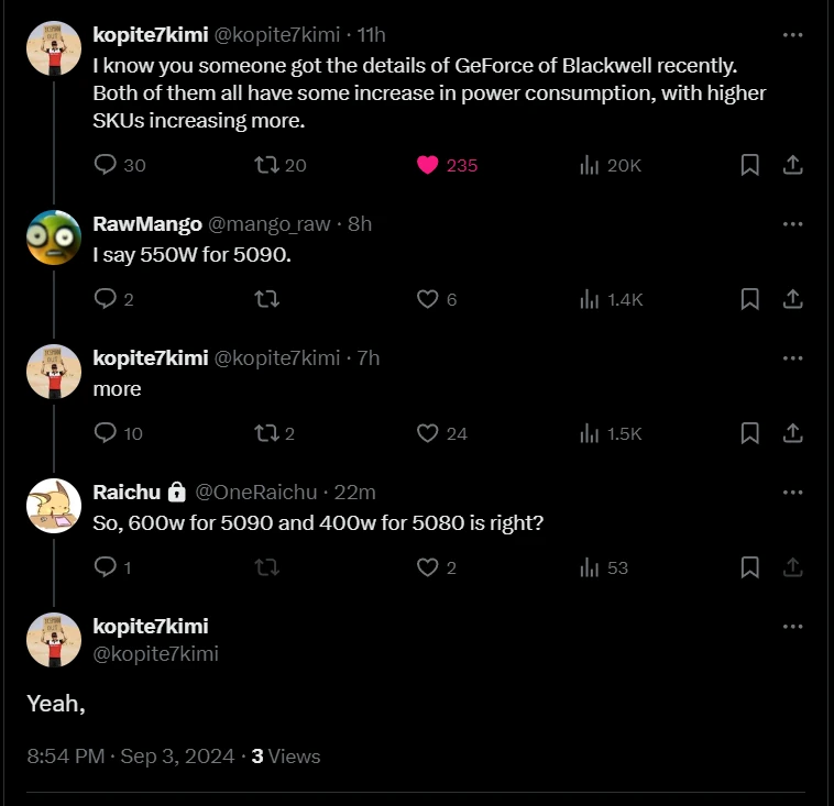 Według użytkownika portalu X (daw. Twitter) o pseudonimie „Kopite7kimi”, NVIDIA GeForce RTX 5090 ma mieć TDP na poziomie 600 W, a więc o 150 W więcej niż GeForce RTX 4090. Model GeForce RTX 5080 będzie się charakteryzował TDP rzędu 400 W, czyli o 80 W więcej. W przypadku GeForce RTX 5070 ma być to powyżej 220 W.
