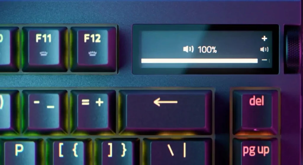 Największym wyróżnikiem na tle konkurencji zdaje się być 2-calowy wyświetlacz OLED. Daje on nam dostęp do szeregu funkcjonalności – wyświetlania temperatury podzespołów, poziomu naładowania akumulatora klawiatury czy sposobu jej podłączenia. Obsługuje też czysto estetyczne opcje, jak statyczny obrazy, tekst i animowane gify. Ekran dopełnia pokrętło, którego funkcjonalność również możemy dostosować do naszych potrzeb.