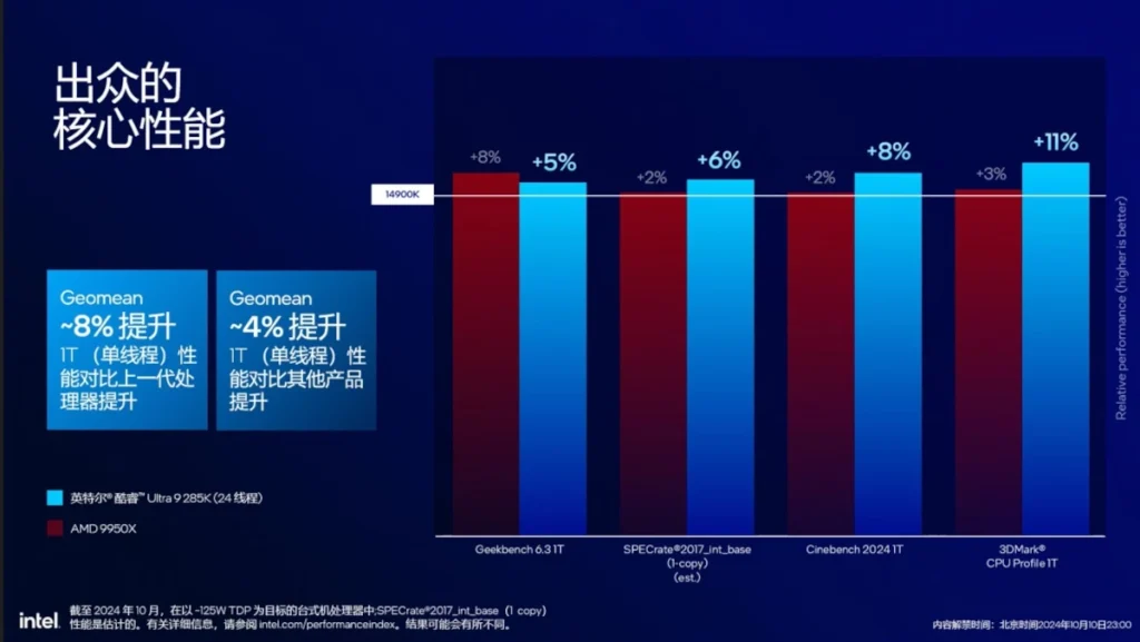 Nie mogło zabraknąć też porównań z bezpośrednią konkurencją, czyli AMD. Do tego celu wykorzystano ich najnowszy i najwydajniejszy procesor AMD Ryzen 9 9950X (16 rdzeni i 32 wątki), który skonfrontowano z nowym flagowcem, Intel Core Ultra 9 285K (24 rdzenie i 24 wątki). Według programu Geekbench, model Niebieskich to wzrost wydajności o 8%.