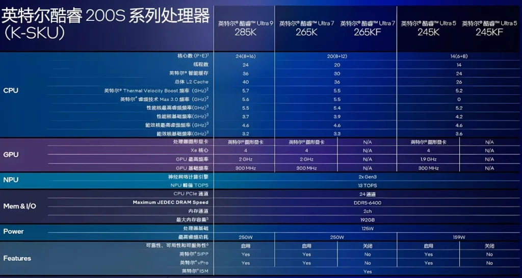 Nie zaskakuje również specyfikacja. Niemal wszystko co ujawniono pokrywa się z wcześniejszymi doniesieniami. Nowością w procesorach przeznaczonych dla komputerów stacjonarnych jest układ NPU, który w przypadku generacji Intel Arrow Lake-S zapewni wydajność na poziomie 13 TOPS. Wszystkie procesory obsługują też do 192 GB pamięci RAM DDR5-6400, a linia -K została wyposażona w iGPU oparte na architekturze Alchemist.