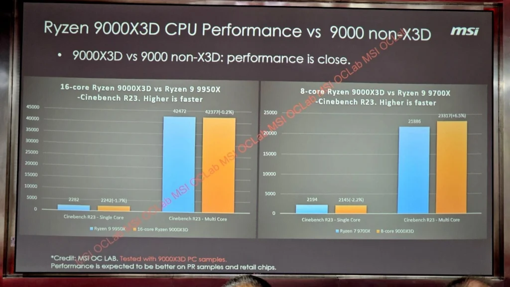 MSI pokusiło się też o porównanie wydajności procesorów AMD Ryzen 9000X3D do serii AMD Ryzen 9000 przy pomocy programu Cinebench R23. Testy przeprowadzono przy taktowaniu 5,2 GHz, co sugeruje, że może być to wartość maksymalna. Jako pokazał benchmark, różnica między układami jest niemal niezauważalna. A więc nie będą to procesory do pracy.
