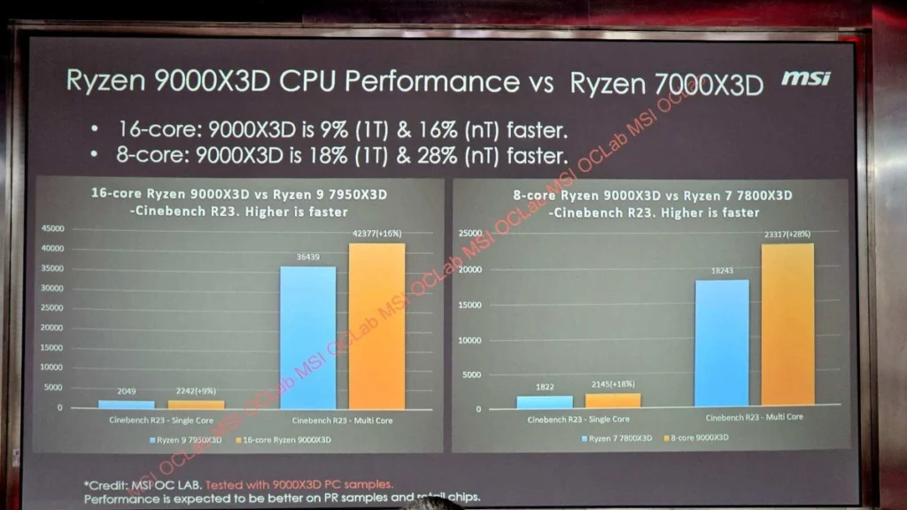 16-rdzeniowy układ z nowej generacji – prawdopodobnie AMD Ryzen 9 9950X3D – został zestawiony z Ryzenem 9 7950X3D i przetestowany w kilku popularnych produkcjach. Wzrost wyniósł od 2% w „Black Myth: Wukong”, przez 4% w „Shadow of the Tomb Raider” aż do 11% w „Far Cry 6”. Model 8-rdzeniowy, w przypadku którego można założyć że jest to AMD Ryzen 7 9800X3D, porównano natomiast z Ryzenem 7 78000X3D. Tutaj wyniki dla poszczególnych gier to kolejno 2%, 2% i 13%. W testach wykorzystano kartę NVIDIA GeForce RTX 4090.