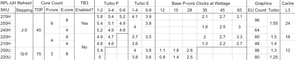 Najnowsze informacje sugerują, że planowane jest siedem różnych modeli – pięć z linii H o TDP na poziomie 45 W oraz dwa z U o mocy 15 W. Nie zobaczymy tutaj jednak przedstawicieli serii Core 9. Najwydajniejszy ma być Intel Core 7 2700H, oferujący 14 rdzeni (6P+8E) i 20 wątków, taktowanie do 5,8 GHz i 24 MB pamięci podręcznej. Najsłabszy zaś Intel Core 3 220U wyposażony w 10 rdzeni (2P+8E) i 12 wątków, zegar do 5,0 GHz i 12 MB pamięci L3.