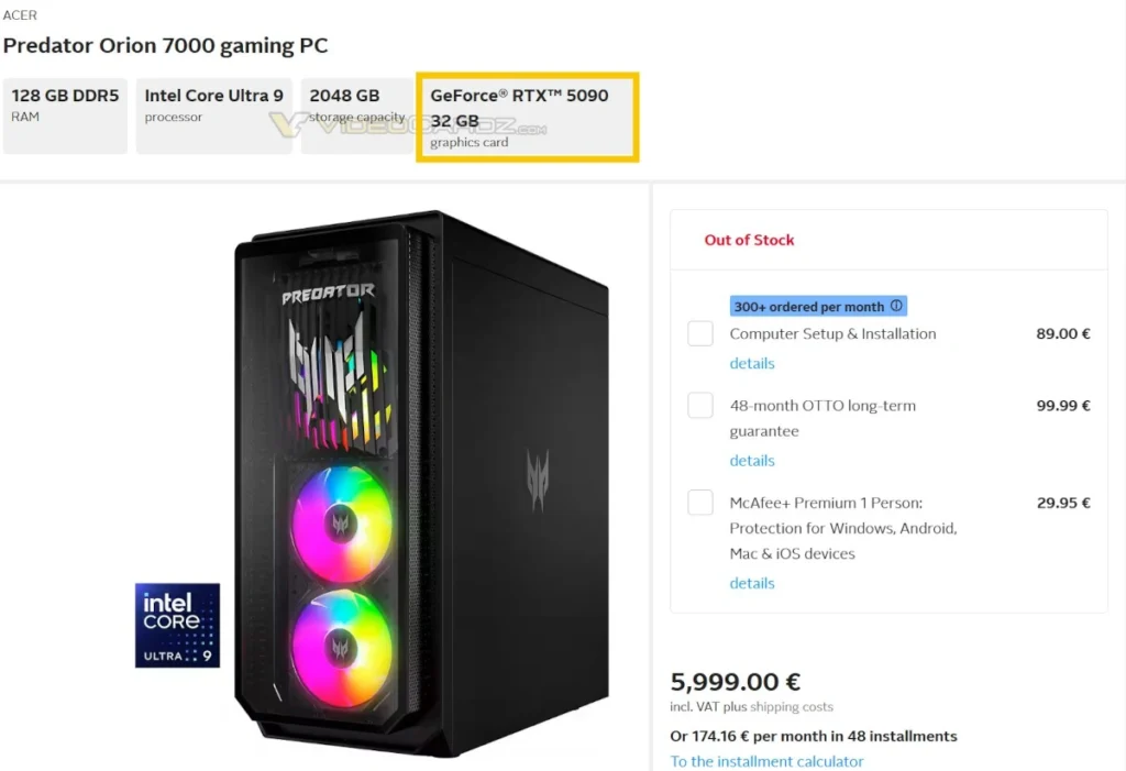 W jednym z niemieckich sklepów internetowych na krótką chwilę, zapewne na skutek błędu, pojawiły się komputery ACER Predator Orion 7000. Pierwszy z nich został wyposażony w procesor Intel Core Ultra 9 285K, 128 GB pamięci RAM DDR5, SSD o pojemności 2 TB i kartę graficzną NVIDIA GeForce RTX 5090. Drugi natomiast posiada w swoim wnętrzu Core Ultra 7 265KF, 32 GB DDR5, 1 TB SSD i układ NVIDIA GeForce RTX 5080.