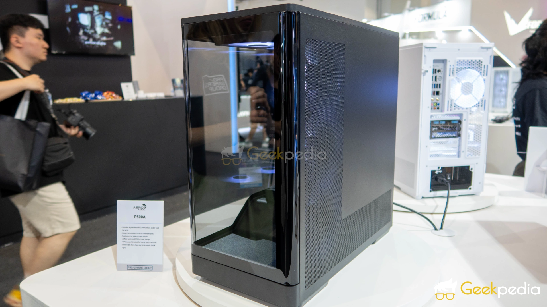 Daniem głównym na stanowisku Tajwańskiego producenta był jednak model AeroCool P500B Digi. Ponownie mamy tutaj do czynienia z formatem Mid Tower oraz umieszczonymi z boku i przodu panelami wykonanymi z hartowanego szkła. W jej wnętrzu zmieścimy karty graficzne o długości do 418 mm, wieżowe chłodzenia procesora o maksymalnej wysokości 165 mm i do dziesięciu wentylatorów. Na start producent oddaje w nasze ręce cztery 120-milimetrowe jednostki z podświetleniem ARGB LED i 3-letnią gwarancją.