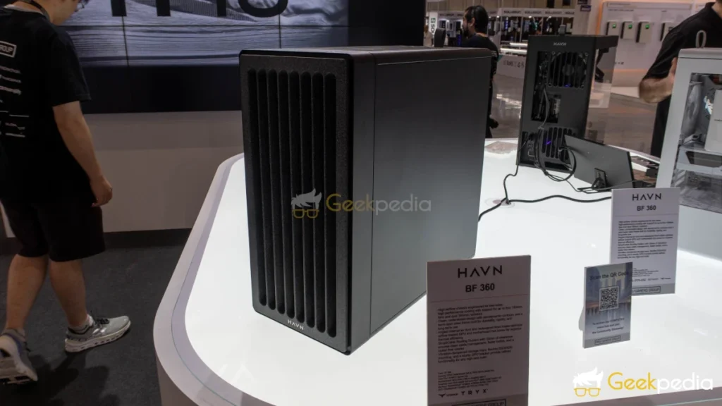 Bez wątpienia w centrum uwagi na stanowisku producenta znalazła się HAVN BF 360, czyli obudowa typu Mid Tower. W przeciwieństwie do popularnych ostatnio konstrukcji w stylu akwarium, stawia ona na zapewnienie systemowi doskonałego przepływu powietrza. Cały przedni panel jest przewiewny, a projekt kratki i filtra został dopracowany w najdrobniejszych szczegółach, by zminimalizować interferencje. W tym samym miejscu znajdziemy standardowy zestaw złącz – 2x USB-A, 1x USB-C oraz audio.