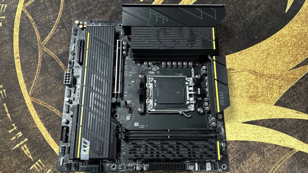 Mamy tutaj do czynienia z konstrukcją Micro-ATX wyposażoną w gniazdo AMD AM5 oraz 15-fazową sekcją zasilania z solidnymi radiatorami. Do naszej dyspozycji oddano dwa banki dla pamięci RAM DDR5, co powinno poprawić stabilność i integralność sygnału. Tajwańczycy zadbali również o sporo miejsca na nośniki SSD w formacie M.2, gdyż zmieścimy ich tu aż trzy. Nie zabraknie też 8-pinowego złącza EPS. Kolorystyka to połączenie czerni i żółci, ale nie zobaczymy tutaj podświetlenia RGB LED w żadnej formie.
