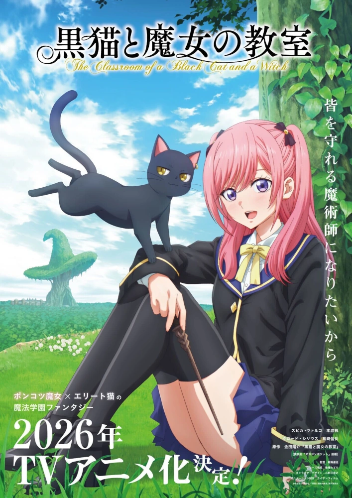 Reżyserią „The Classroom of a Black Cat and a Witch” zajmie się Naoyuki Tatsuwa („Puella Magi Madoka Magica”, „Fire Force”), natomiast scenariusz pisze Midori Gotō („Guilty Crown”, „Psycho-Pass”). Postacie projektuje Takayuki Onoda („Rascal Does Not Dream of Bunny Girl Senpai”, „ERASED”), a nad prawidłowym postępem prac czuwa studio LIDEN FILMS. Data premiery została wyznaczona na szeroko pojęty rok 2026, a o premierze na Zachodzie na tak wczesnym etapie nic niestety nie wiadomo.