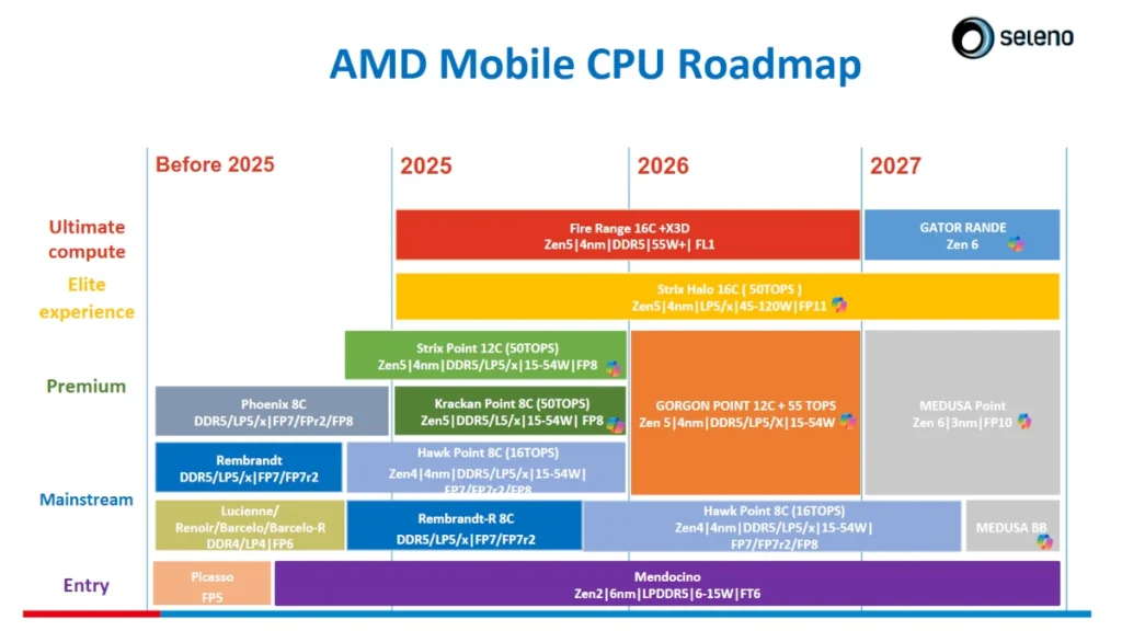 AMD Gator Range będzie nową flagową serią, mająca zastąpić rodzinę AMD Fire Range „HX” i oferować topową specyfikację podobną do desktopowych układów – do 24 rdzeni i 32 wątków. Następne są dwie pozycję, których nazwy inspirowane są mitologią grecką – AMD Medusa Point, następca AMD Strix Point, oraz AMD Medusa BB dla średniej półki cenowej.