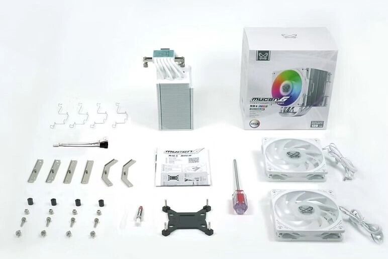 Scythe Intros Mugen 6 Dual Fan White Edition to jak sama nazwa wskazuje biała wersja kolorystyczna. Ma ona wymiary 132 x 132 x 154 mm oraz mase 1,23 kg. Mamy tutaj do czynienia z aluminiowym radiatorem oraz sześcioma 6-milimetrowymi rurkami cieplnymi. Zarówno ciepłowody, jak i podstawa zostały poniklowane.