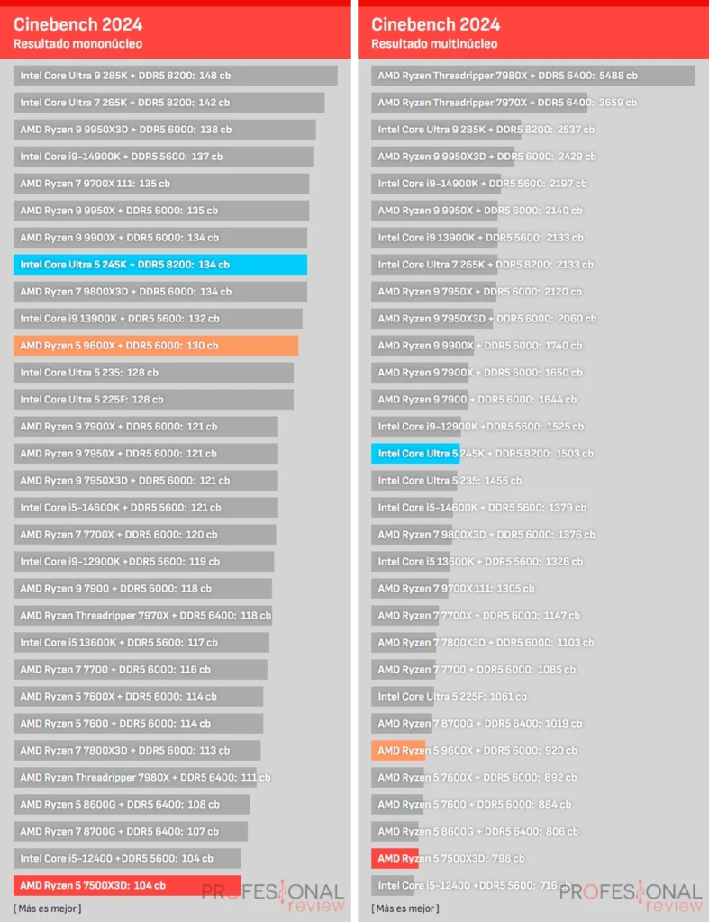 Potwierdzają to wyniki Profesional Review, które mówi o zaledwie 5% lepszej wydajności niż Intel Core Ultra 5 245K – z zastrzeżeniem, że zawyża to Cyberpunk 2077 działający o 20% lepiej. Jednak Cinebench 2024 jest bezlitosny. Tutaj Niebiescy są o 29 i 88% wydajniejsi.