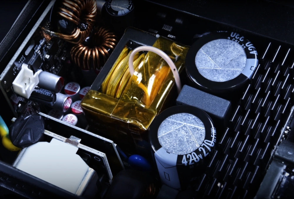 Wnętrze chłodzone jest przez 92-milimetrowy wentylator z łożyskiem FDB, który pozostaje wyłączony aż do 40% obciążenia PSU. Przewody to płaskie wiązki w oplocie tekstylnym, które są elastyczne i odpowiednio skrócone – tak by łatwo je było ułożyć w małych PC. Do dyspozycji mamy jedną wtyczkę ATX (24-pin), dwie EPS (4+4-pin), trzy PCIe (6+2-pin), jedną 12V-2×6 (16-pin), pięć SATA i dwie Molex.