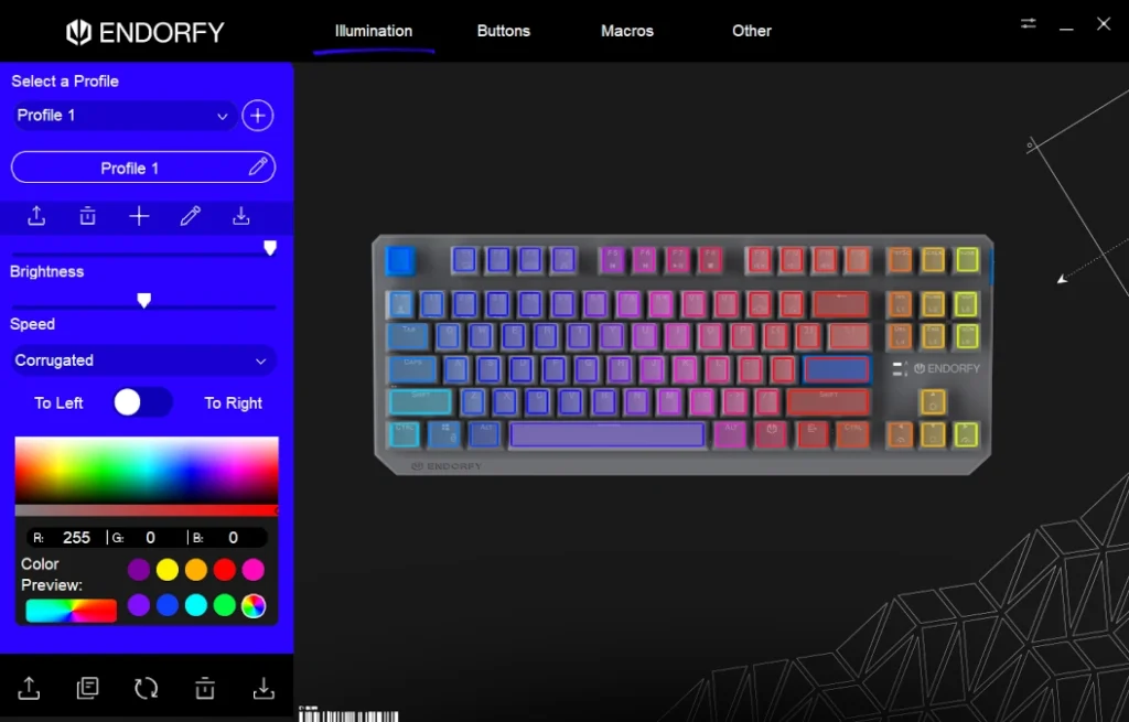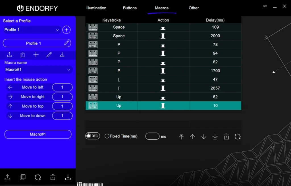 Nie znajdziemy w nim tak naprawdę nic odkrywczego. Producent uraczył nas standardowym zestawem opcji, które podzielono na kilka zakładek. Pierwsza z nich odpowiada za sterowanie podświetleniem ARGB. Możemy tutaj skorzystać z kilku predefiniowanych trybów, stworzyć całkiem nowe lub też całkiem je wyłączyć. Druga natomiast pozwala przypisać poszczególnym przyciskom dodatkowe funkcje – od włączenia konkretnej aplikacji, po użycie własnego makra. Opcja ich tworzenia znajduje się w kolejnej sekcji i jest całkiem rozbudowana. Wybieramy bowiem nie tylko konkretne klawisze, ale i siłę ich nacisku.