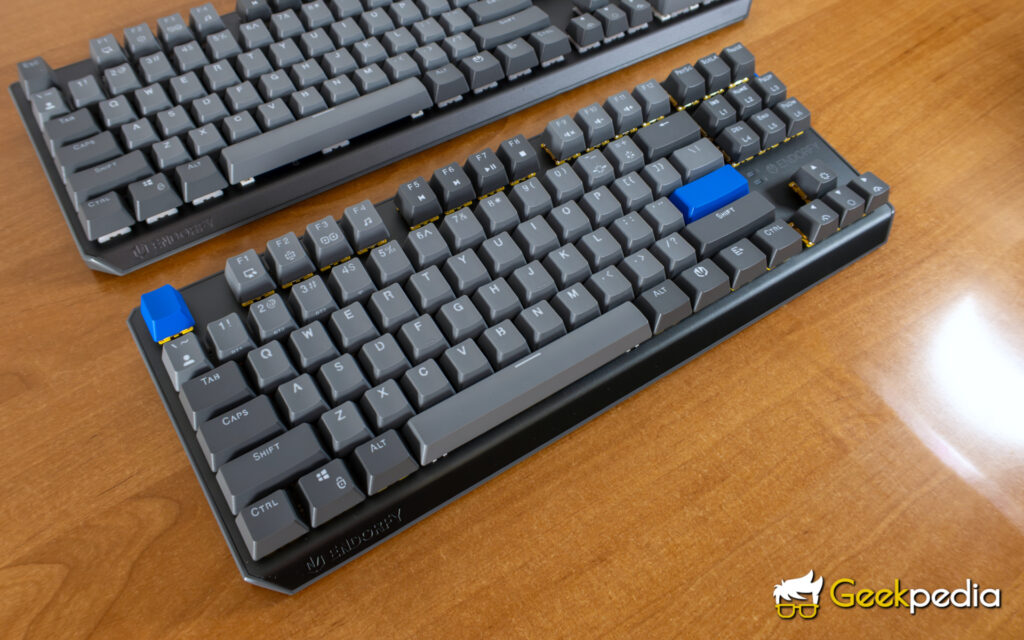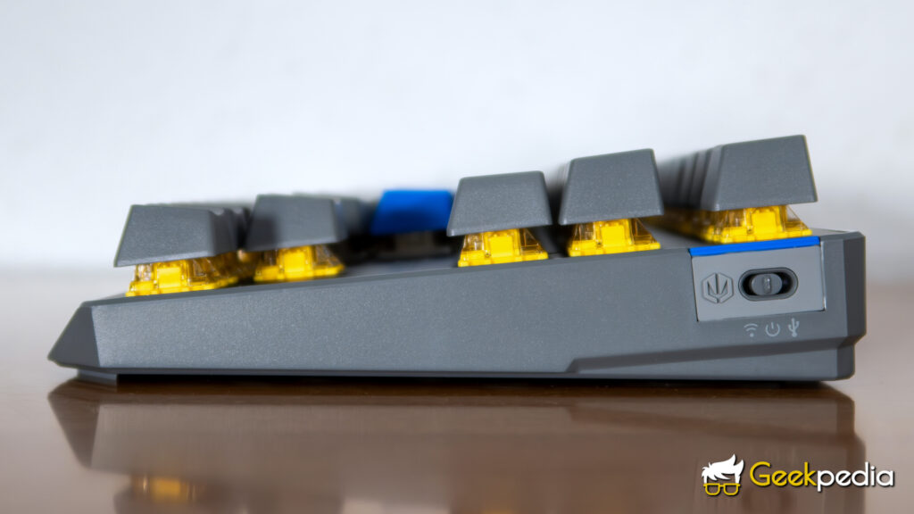 Zgodnie z nazwą mowa o bezprzewodowej klawiaturze bez bloku numerycznego. Ma ona wymiary 361,5 x 140 x 42,5 mm oraz masę 855 g. Znajdziemy tutaj 87 klawiszy, jednak zabrakło wśród nich pokrętła lub dedykowanych przycisków multimedialnych. Jeśli chodzi o łączność, to producent oddaje do naszej dyspozycji trzy tryby łączności – połączenie przewodowe za pomocą USB, Bluetooth oraz radioodbiornik 2,4 GHz. Można się między nimi szybko i prosto przełączać za pomocą umieszczonego z boku suwaka.