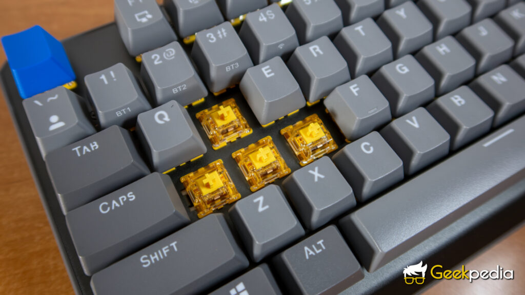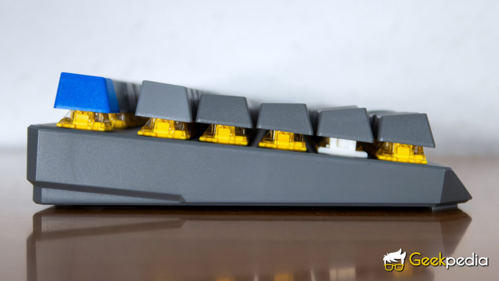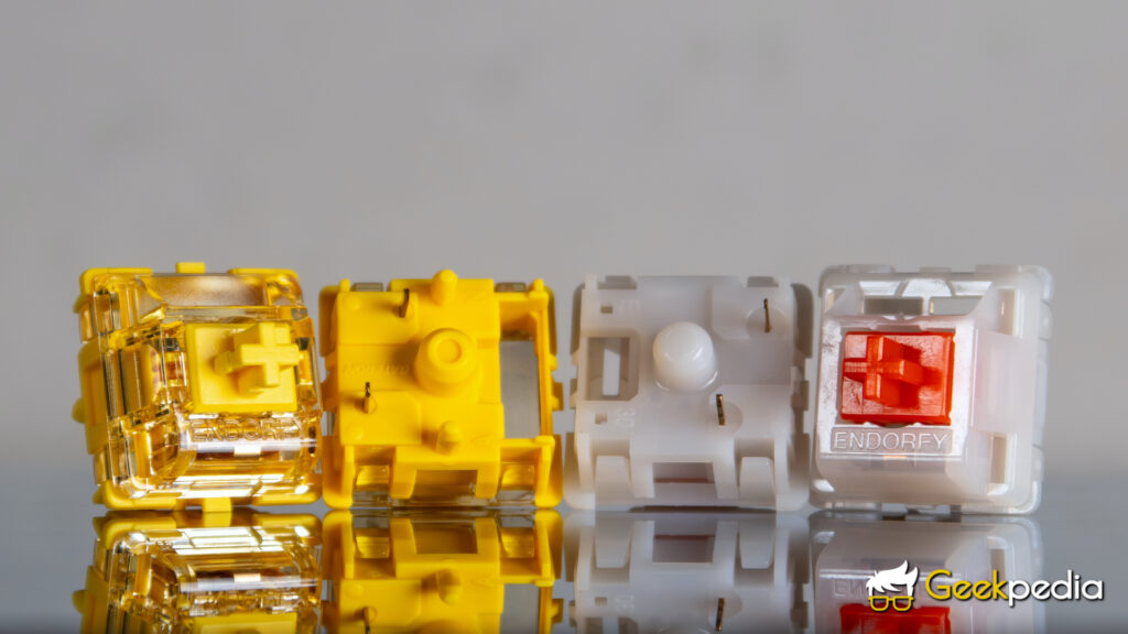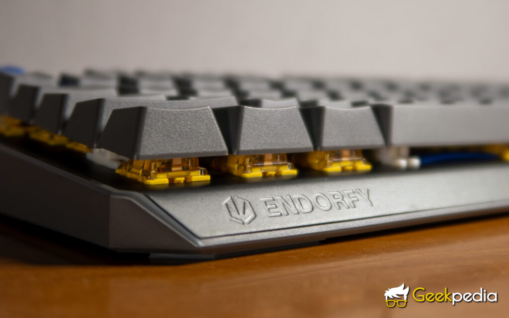 Zastosowane przełączniki to Endorfy Yellow, powstałe we współpracy z firmą Gateron. Zostały one fabrycznie nasmarowane, siła wymagana do ich aktywacji wynosi 49 g, a całkowity dystans to 3,6 mm. Producent zdecydował się też na układ Cherry, co w połączeniu z obecną tutaj funkcją hot-swap pozwala nam na bezproblemową ich wymianę bez lutowania. Warto nadmienić, że wspierane są zarówno switche 5-, jak i 3-pinowe.
