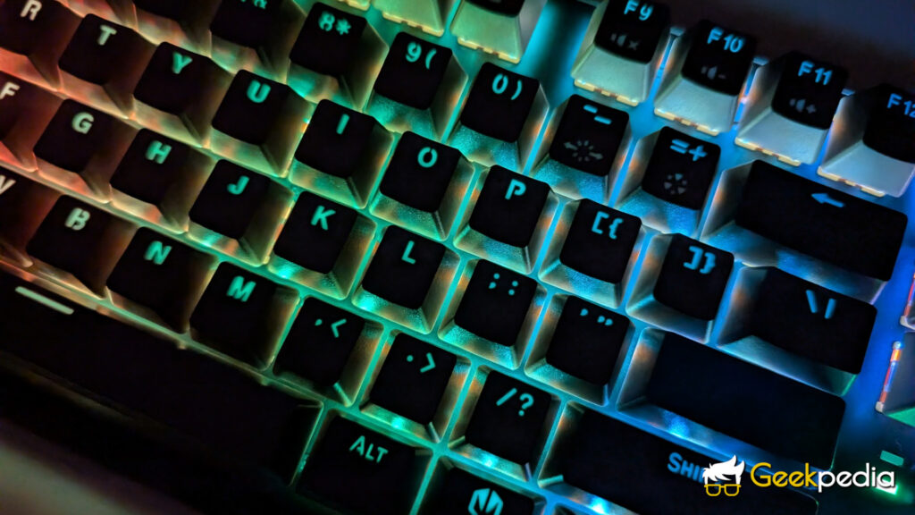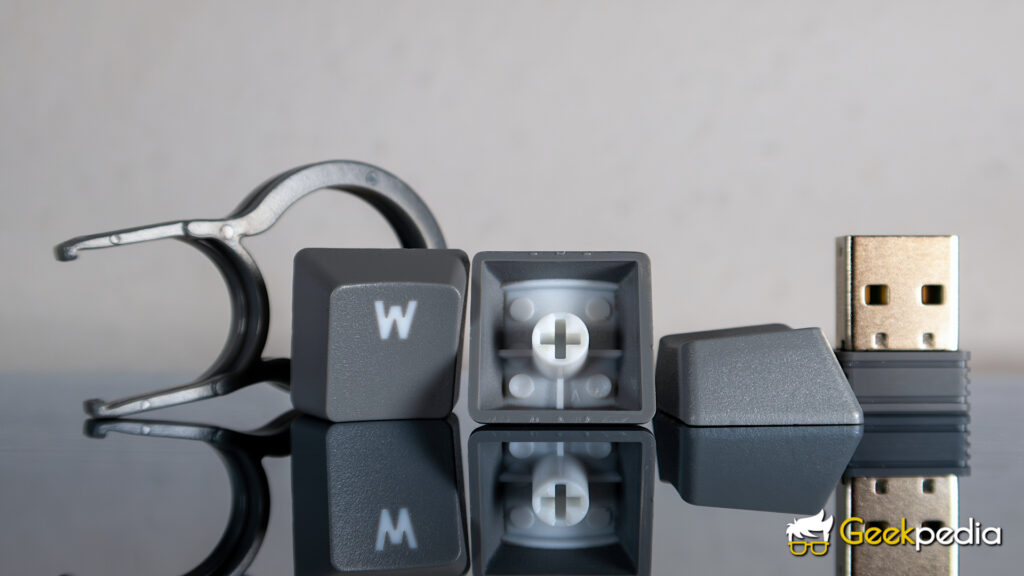 Nakładki wykonano przy użyciu technologii PBT typu double-shot, co jest sporym plusem. To znacznie lepsze rozwiązanie niż ABS, oferujące większą odporność na ścieranie i przyjemniejszą charakterystykę dźwięku. Niestety, ponownie użyto tutaj tej samej, specyficznej czcionki co w Celeris 1800. Nie jest ona co prawda nieczytelna, ale z racji swojego„gamingowego” charakteru może części osób nie przypaść do gustu.